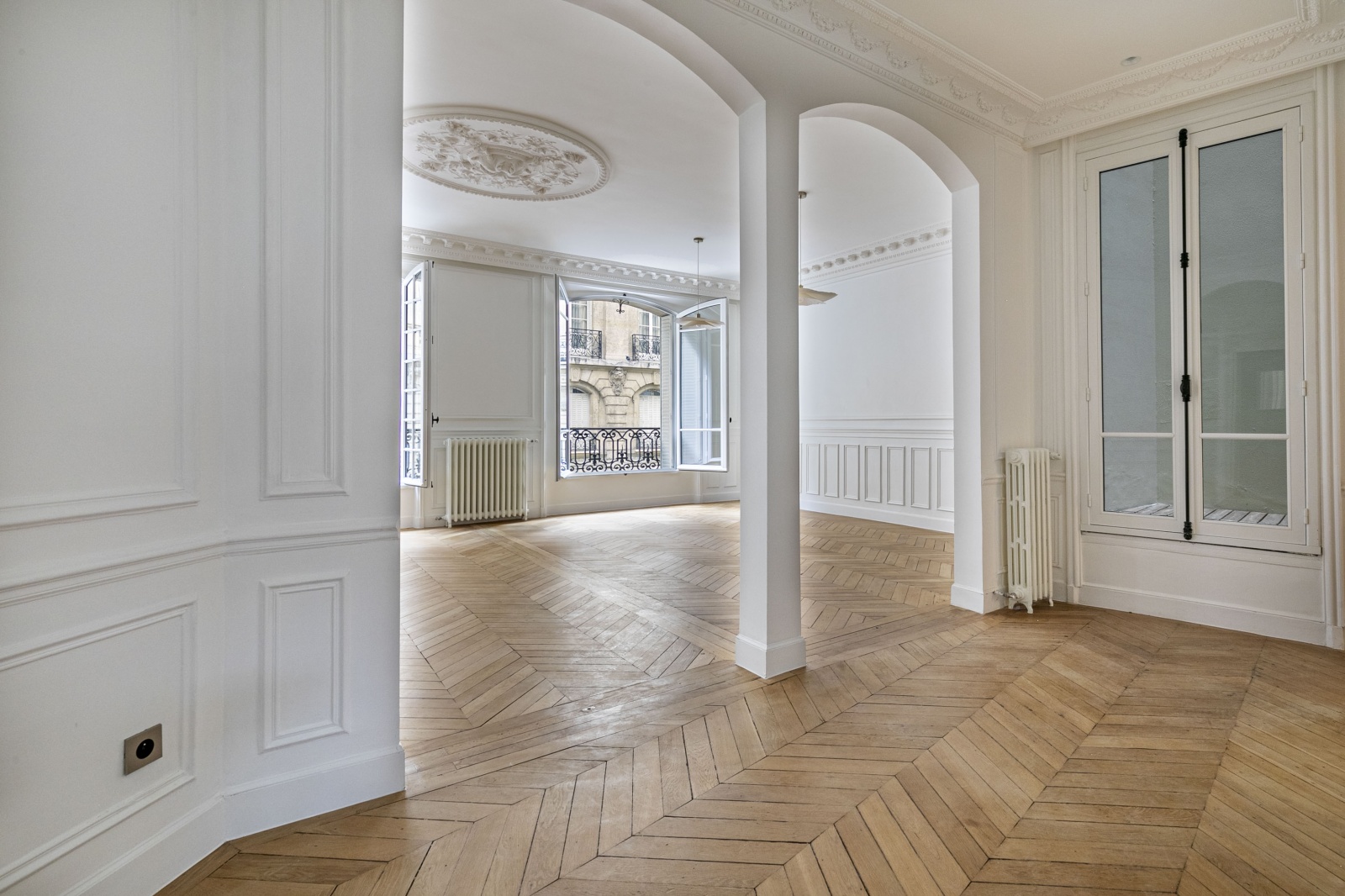 Period solid parquet flooring, more than 3 m high ceilings, very high standard finishes and work.
