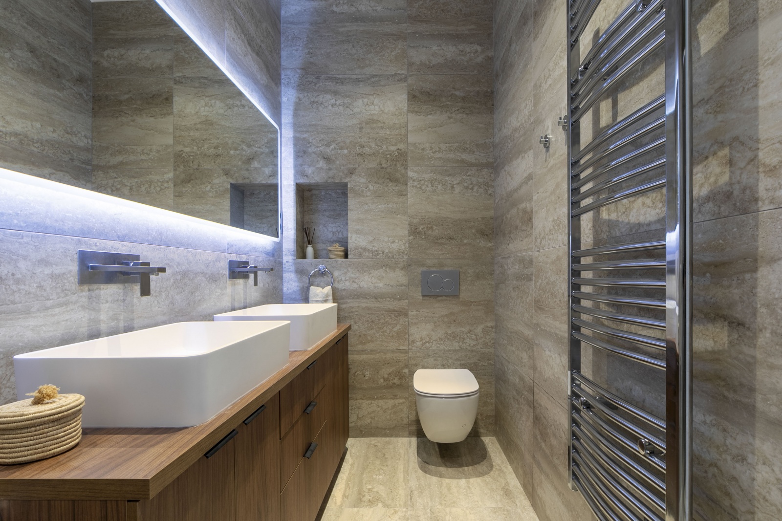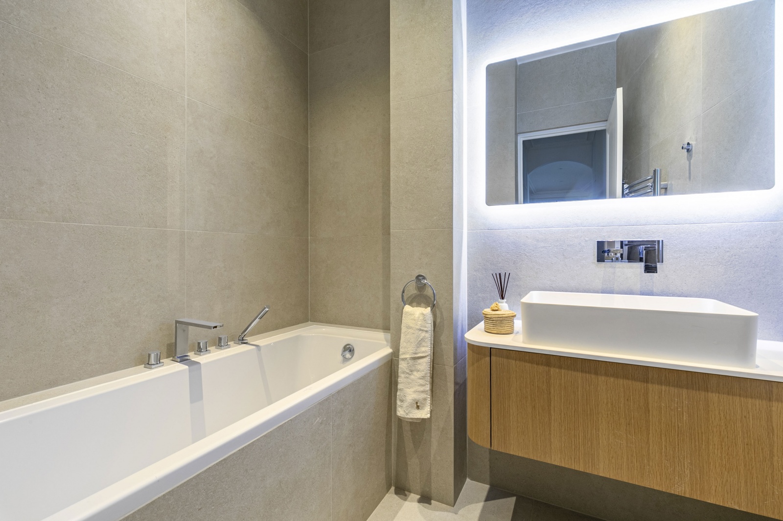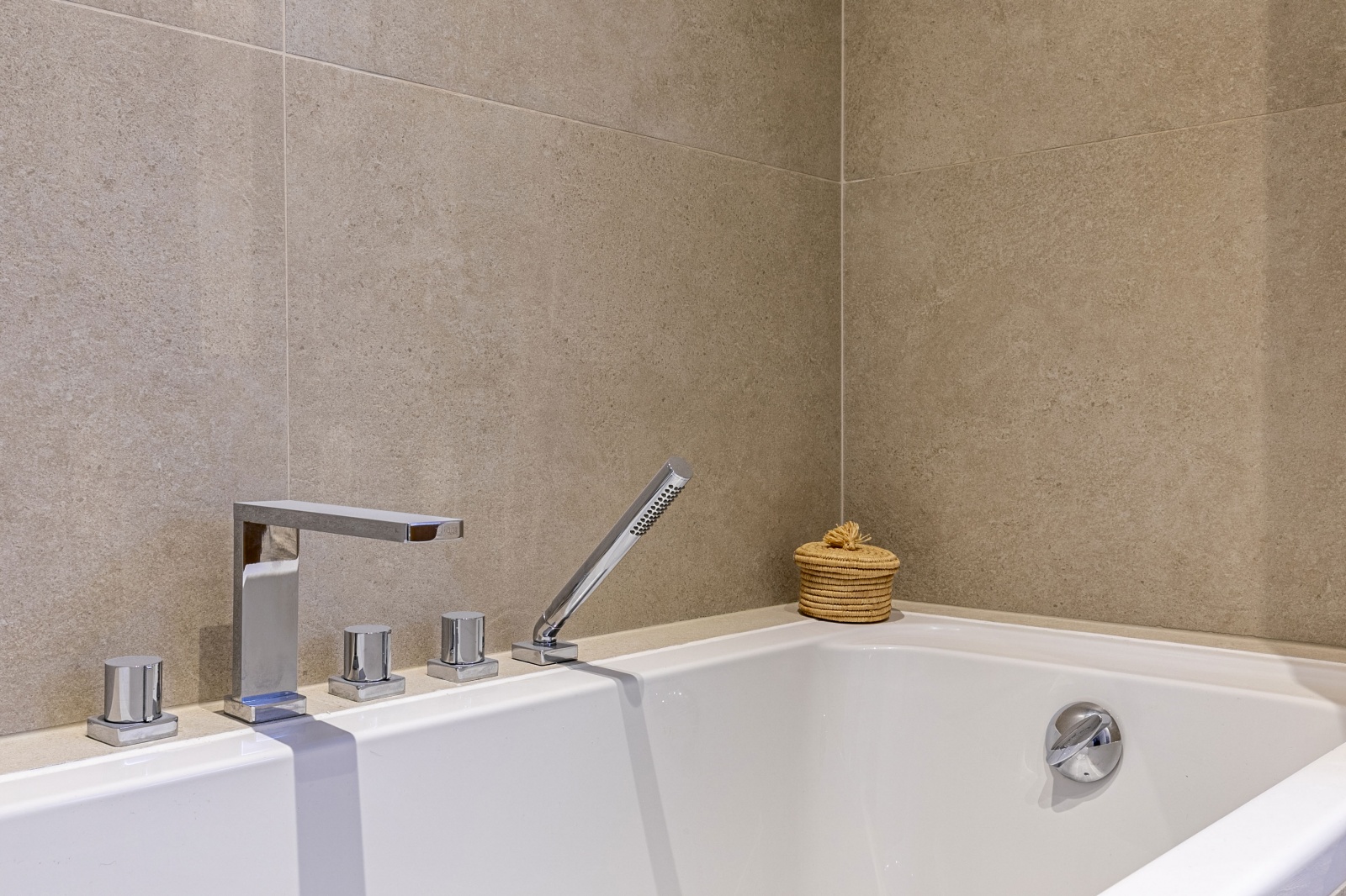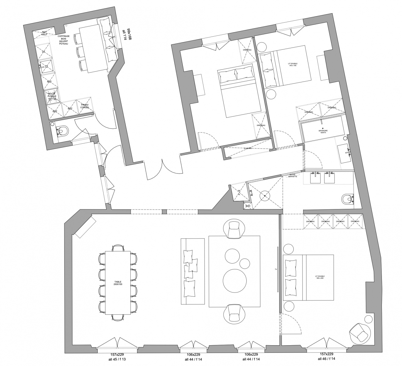 It consists of an entrance gallery opening onto a double living room, a fully equipped kitchen with new appliances (fridge/freezer, oven, hotplates, dishwasher and hood), a suite with walk-in shower, WC and dressing room, two bedrooms with integrated dressing rooms, a bathroom with bathtub, and a separate WC.
